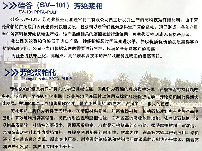 SV-101 PPTA-PULP is a high-tech short fiber material independently developed and produced by Hebei Silicon Valley Chemical Co.,Ltd. Due to the wide application of aramid pulp,it has also been developed rapidly. Our company uses Silicon Valley fiber as raw material to produce aramid pulp,and has formed a high-tech aramid pulp,and has formed a high-tech aramid pulp production line with an annual output of 500 tons. The product can be used in relevant friction and sealing industries to replace asbestos to make non asbestos products.